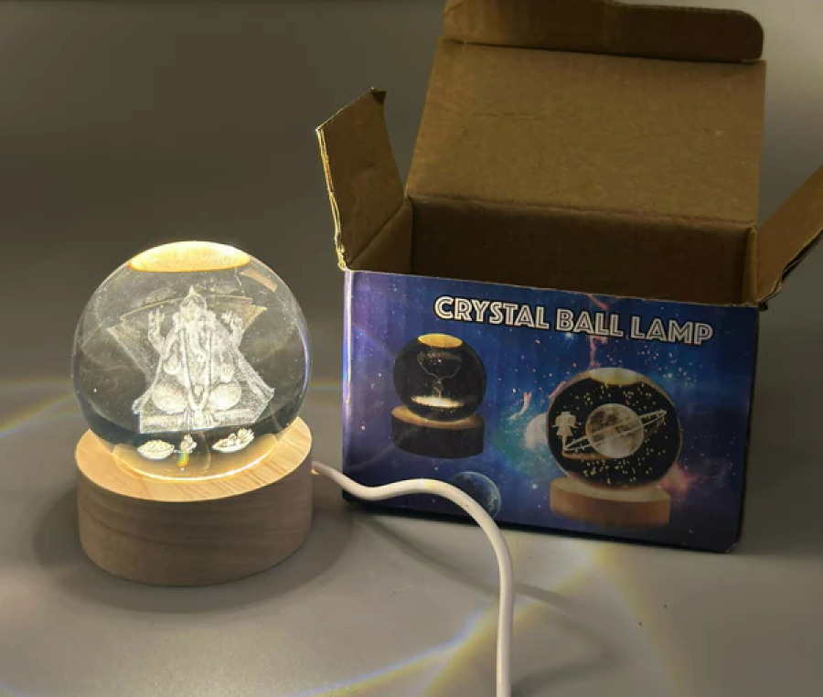 3D Crystal Glass Ball with LED Wooden Base – Engraved Lord Ganesha Decorative Night Light – Spiritual Gift for Home, Mandir, Diwali, Office Desk, and Meditation Décor