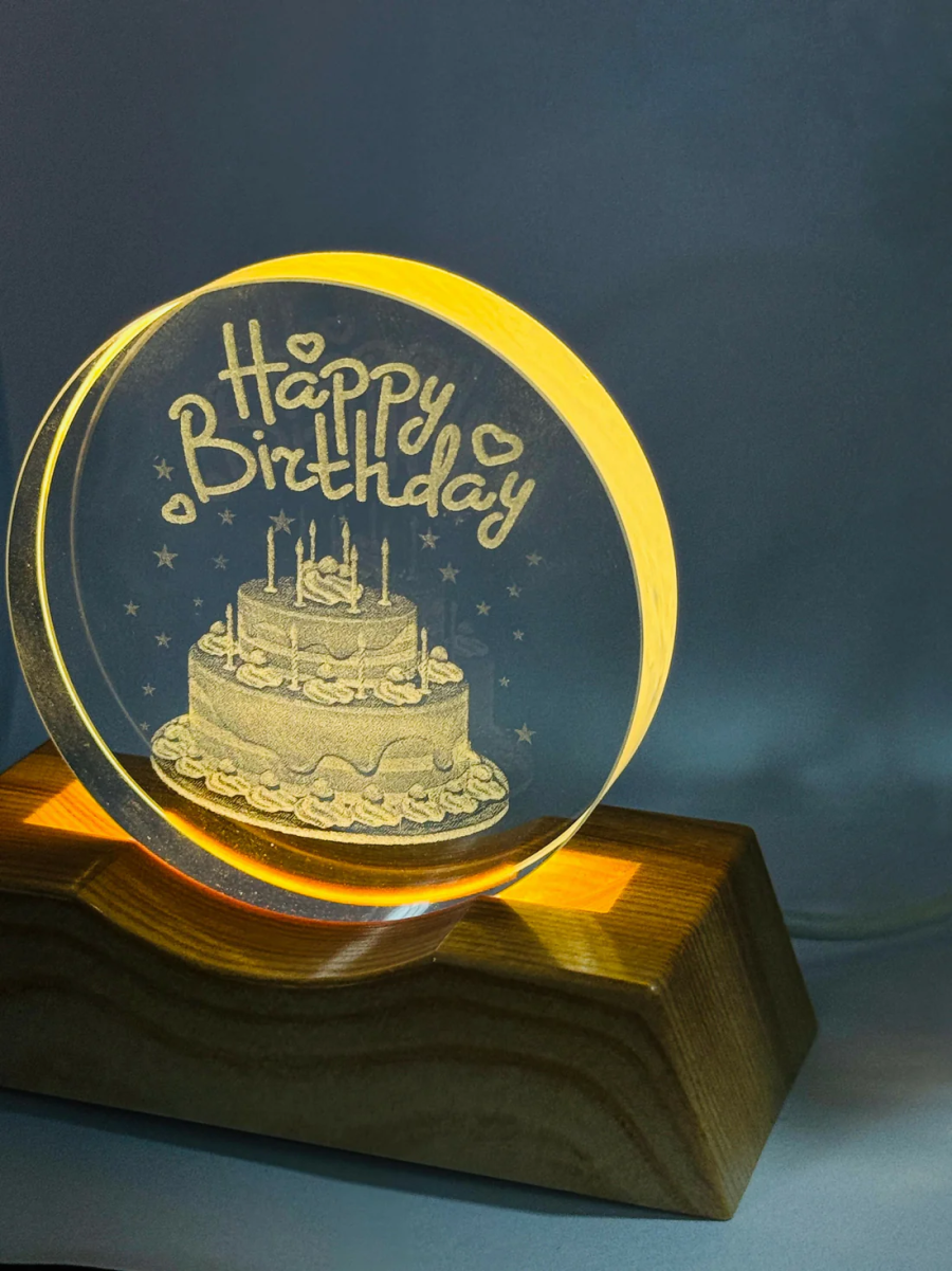 Celebrate birthdays in a magical way with this enchanting Happy Birthday Acrylic LED Night Lamp. Featuring a beautifully laser-engraved birthday cake and greeting on clear acrylic, this lamp glows warmly from its wooden base, casting soft reflections and creating a joyful ambiance. USB powered and perfect for party decor, bedside lighting, or as a heartfelt birthday gift for friends, kids, and loved ones. A modern and charming keepsake for memorable celebrations.