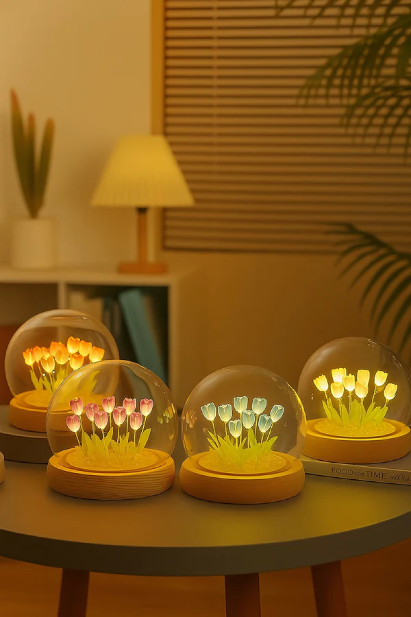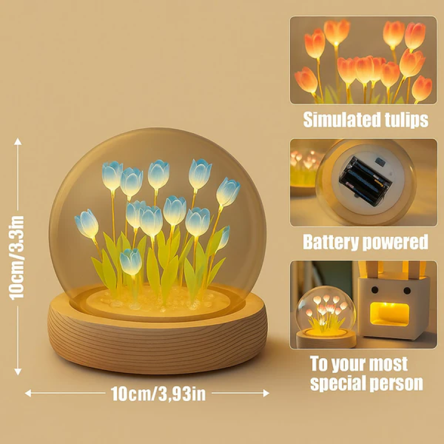 Brighten your space with elegance and tranquility using this LED Blue Tulip Flower Light Dome. Encased in a crystal-clear glass globe, vibrant blue tulip-shaped lights bloom from soft green stems, resting on a natural wood-look base. This artificial flower lamp emits a soft, calming glow perfect for bedside tables, living rooms, or mood lighting. A unique fusion of art and ambiance, it also makes a beautiful gift for birthdays, anniversaries, housewarmings, or romantic occasions.