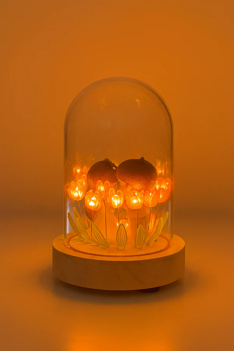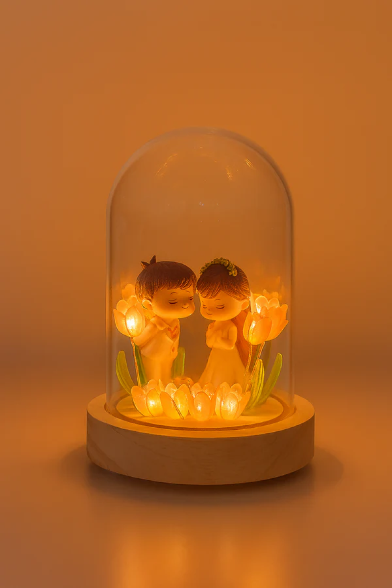 Celebrate the magic of love with the Eternal Blossom Couple Dome Light, a charming decorative piece featuring an adorable couple encased in a crystal-clear dome. Surrounded by delicate pink tulip flowers and set on a natural wood base, this heartwarming scene glows beautifully when the built-in light is switched on (optional variant).