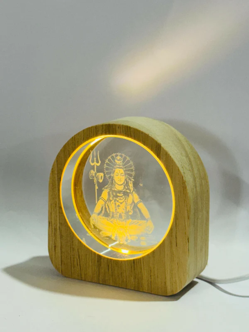 Meditating Lord Shiva 3D LED Night Lamp with Laser Engraved Crystal Glass and Wooden Frame – USB Powered Table Light with Warm Yellow Glow | Spiritual Decor Showpiece for Home, Temple, Yoga & Meditation Corners