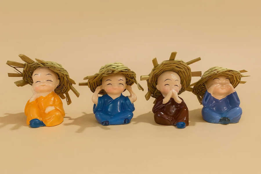 ring joy, serenity, and charm to your space with this adorable Set of 4 Mini Monk Figurines, each crafted in vibrant colors with expressive poses: Hear No Evil, See No Evil, Speak No Evil, and Think No Evil. Designed with delightful detailing and natural-looking straw hats, these monks are made from durable resin, perfect for decorating desks, shelves, dashboards, or gifting on special occasions. Ideal for home décor lovers and spiritual enthusiasts, these figurines represent peace, mindfulness, and playfulness in one artistic set.