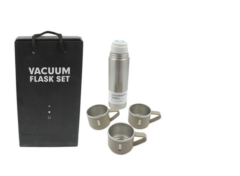 Enjoy your favorite beverages at the perfect temperature wherever you go with this Stainless Steel Vacuum Flask Set, featuring a 500 ML flask along with 3 matching stainless steel cups. Perfect for coffee, tea, hot drinks, or chilled water, this flask keeps beverages hot or cold for hours, making it an excellent companion for travel, office, picnics, and outdoor activities.