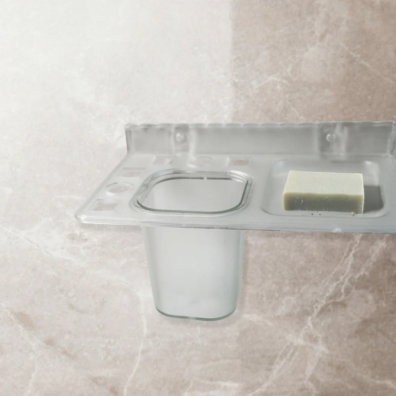 Design: It is a transparent or semi-translucent plastic accessory that is attached to a marble-style wall using suction cups or adhesive mounts.