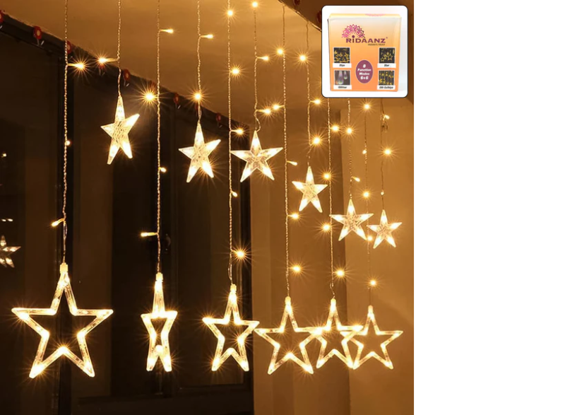 12 Stars LED Curtain String Lights with 8 Flashing Modes for Home Decoration, Diwali & Wedding LED Christmas Light Indoor and Outdoor Light ,Festival Decoration (Warm White / With Box)