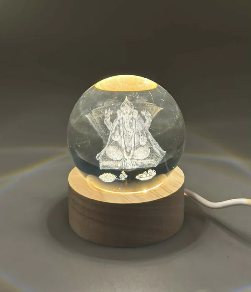 3D Crystal Glass Ball with LED Wooden Base – Engraved Lord Ganesha Decorative Night Light – Spiritual Gift for Home, Mandir, Diwali, Office Desk, and Meditation Décor