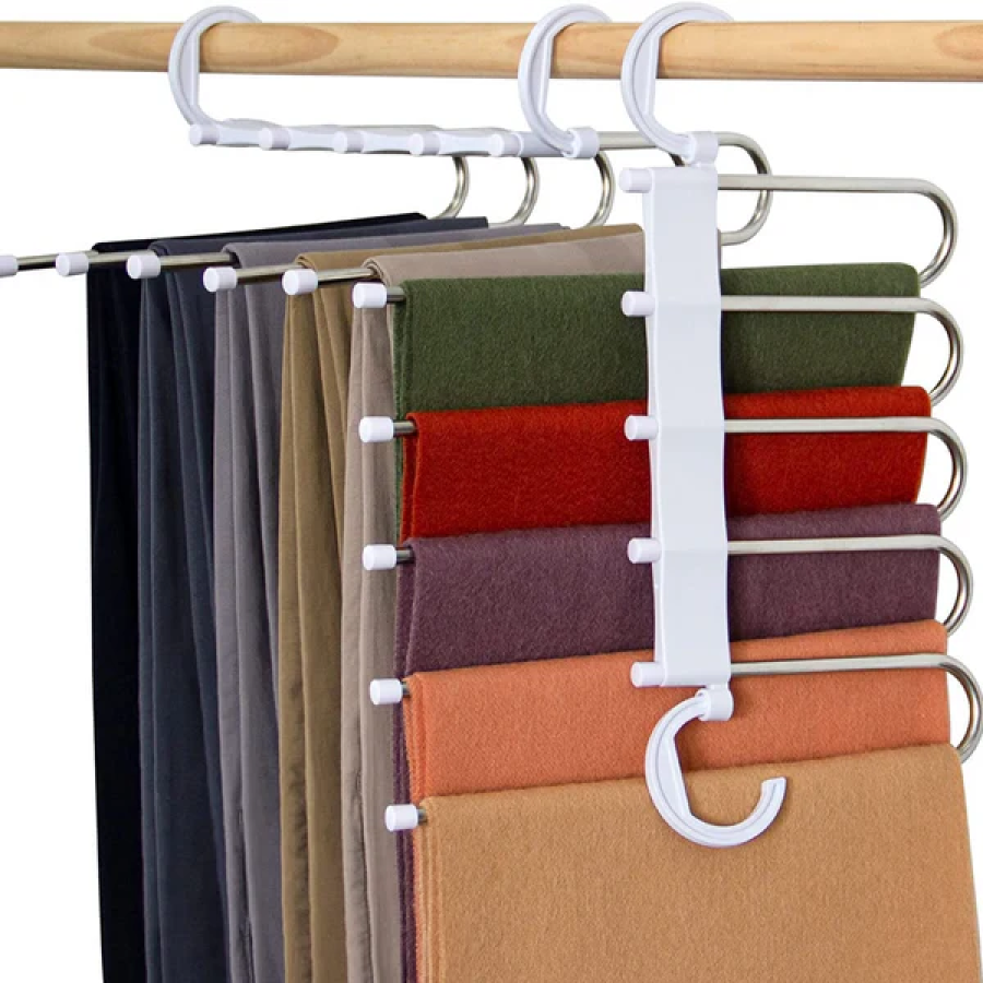 Household Plastic & Stainless Steel 5 In 1 Multi-Layered Mass Pant Hangers, Folding Storage Pant Rack Shelves