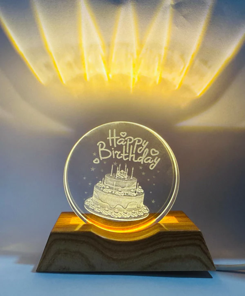 Celebrate birthdays in a magical way with this enchanting Happy Birthday Acrylic LED Night Lamp. Featuring a beautifully laser-engraved birthday cake and greeting on clear acrylic, this lamp glows warmly from its wooden base, casting soft reflections and creating a joyful ambiance. USB powered and perfect for party decor, bedside lighting, or as a heartfelt birthday gift for friends, kids, and loved ones. A modern and charming keepsake for memorable celebrations.