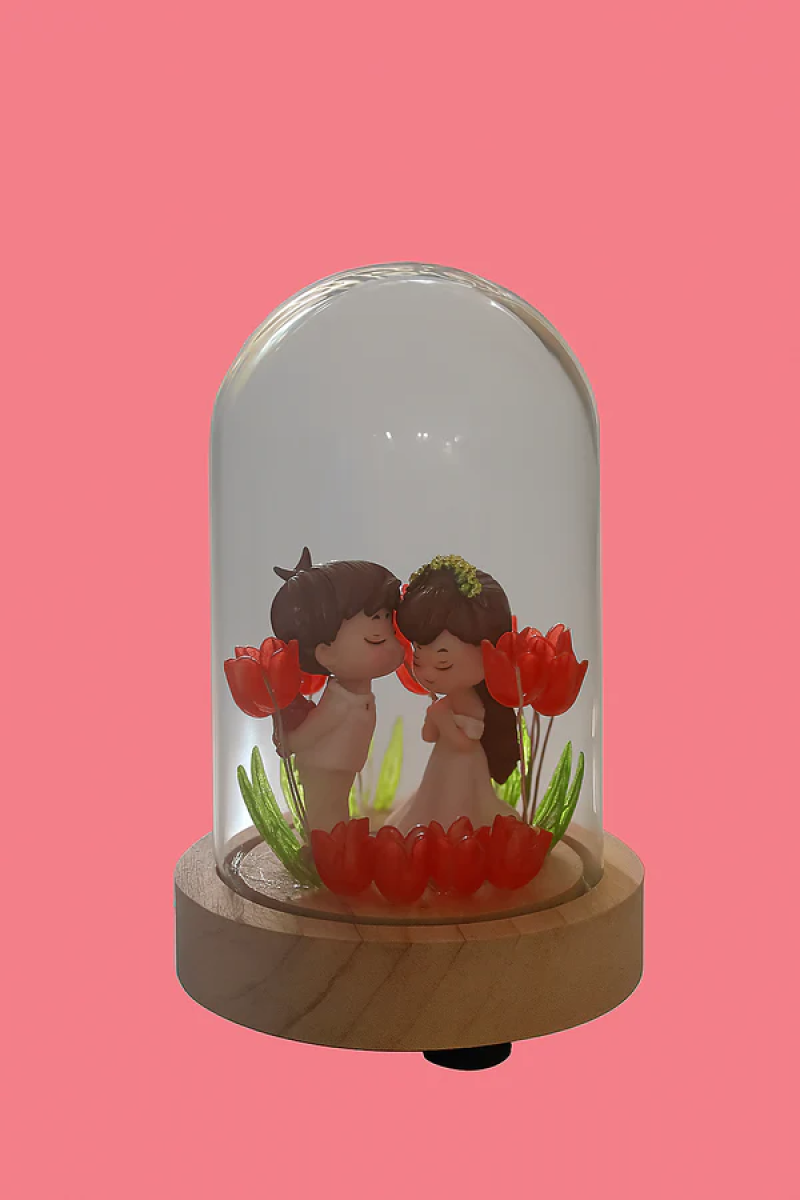 Celebrate the magic of love with the Eternal Blossom Couple Dome Light, a charming decorative piece featuring an adorable couple encased in a crystal-clear dome. Surrounded by delicate pink tulip flowers and set on a natural wood base, this heartwarming scene glows beautifully when the built-in light is switched on (optional variant).