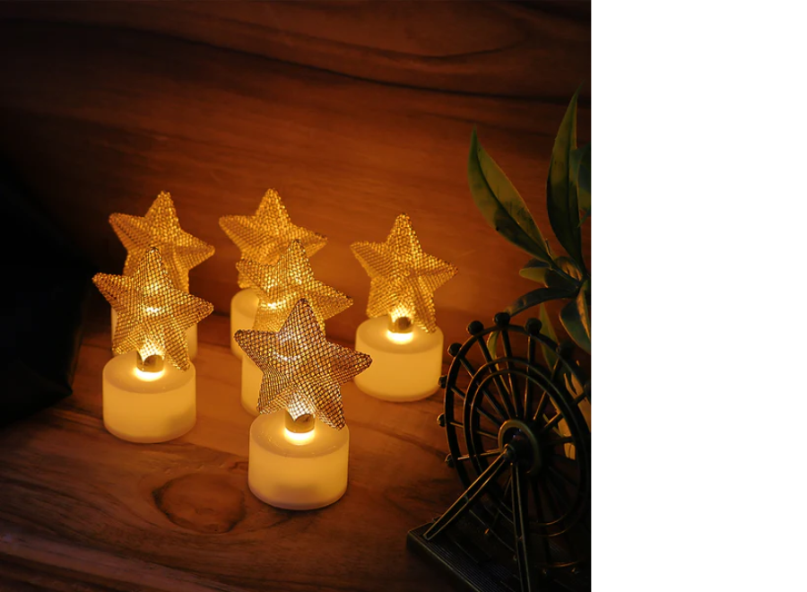 Whether placed on rangolis, pooja thalis, dining tables, balconies, stairways, or as centerpiece decorations, this pack of 6 star candles allows you to create elegant arrangements that enhance the beauty of any setting. Compact, portable, and long-lasting, they are an eco-friendly alternative to traditional wax candles.