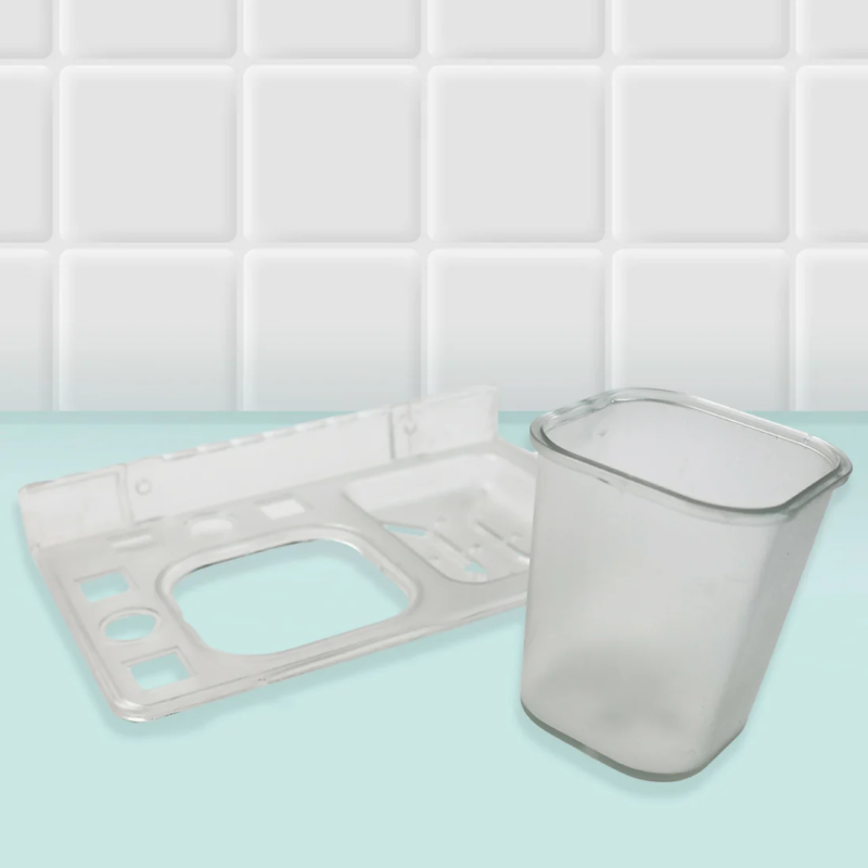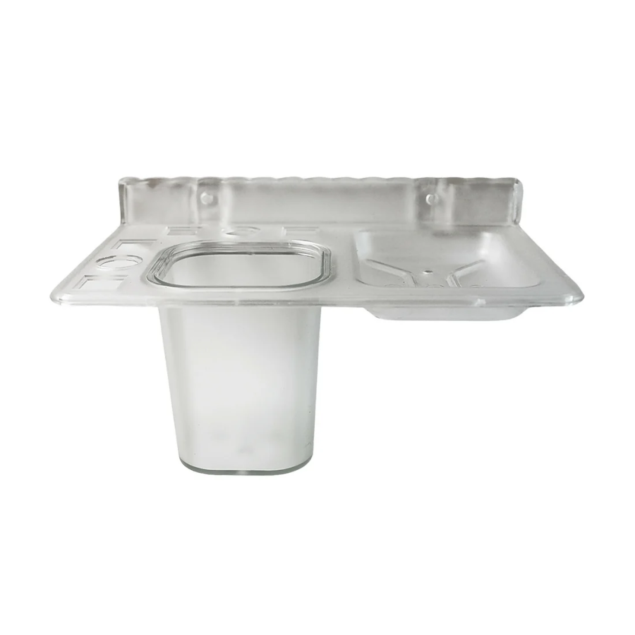 Design: It is a transparent or semi-translucent plastic accessory that is attached to a marble-style wall using suction cups or adhesive mounts.